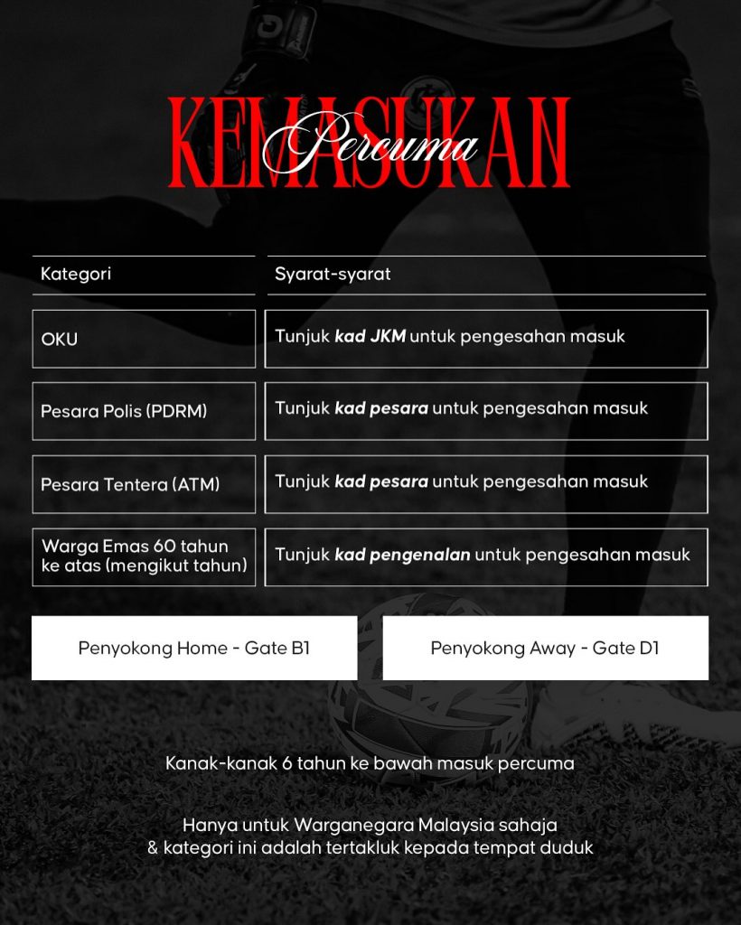 Setiap perlawanan ‘Home’ di Stadium BolaSepak Kuala Lumpur, Cheras ada kemasukan percuma untuk: