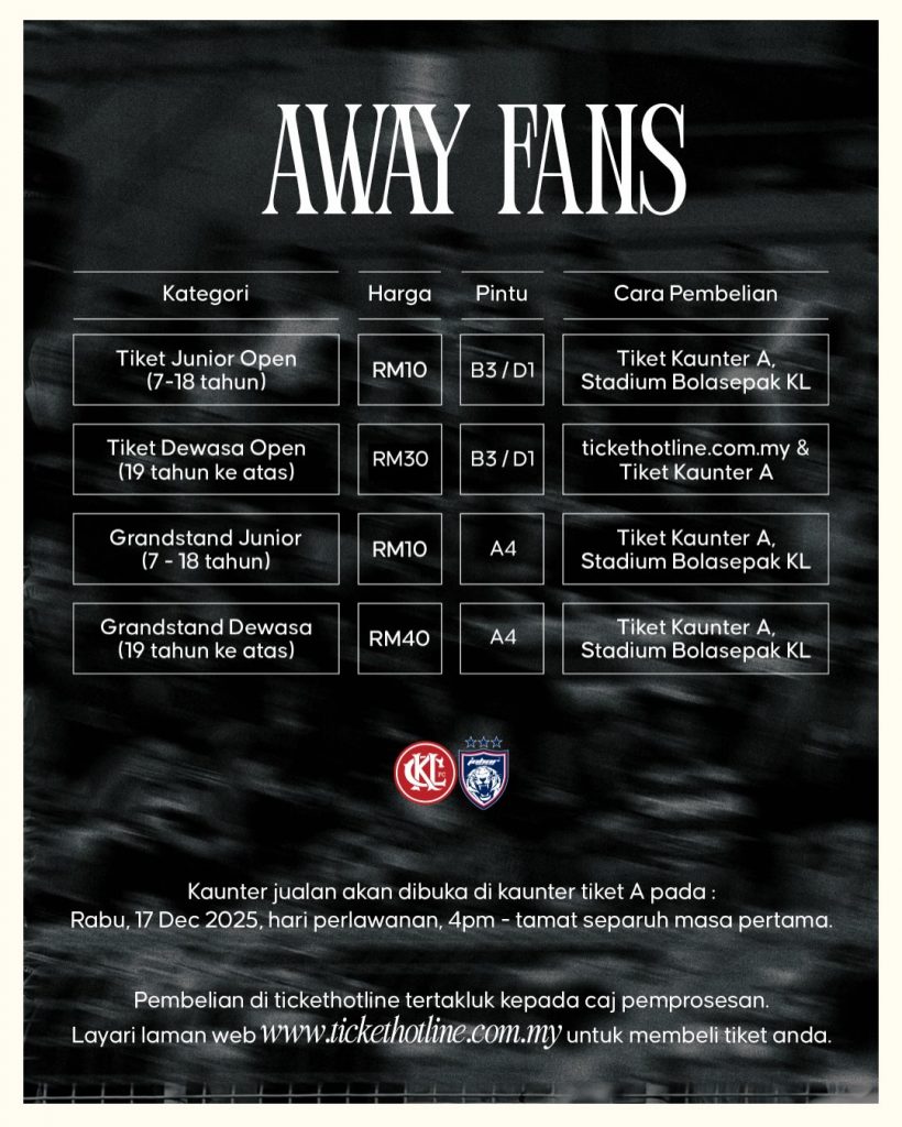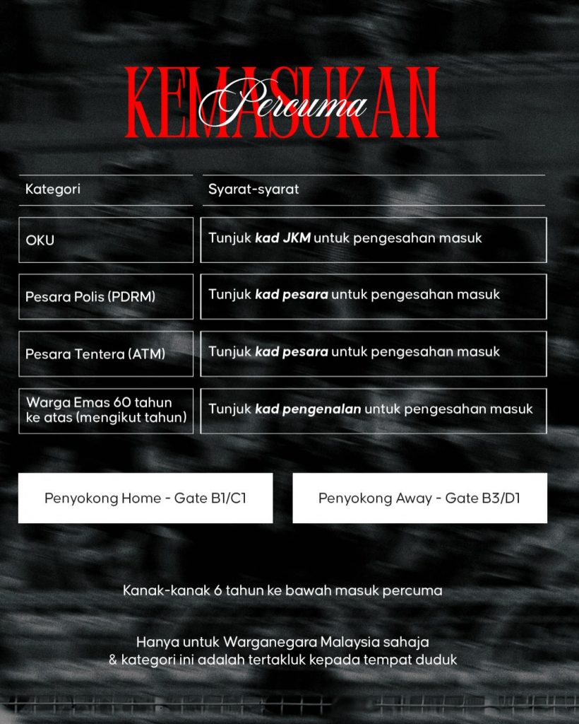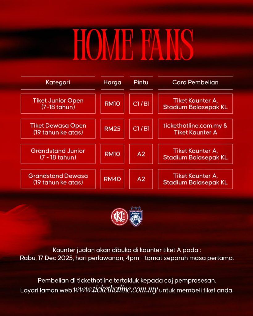 Dapatkan tiket online anda di (Tickethotline) sekarang ataupun tiket fizikal, di kaunter A (dijual pada hari perlawanan) bermula 4 petang sehingga tamat separuh masa pertama ![]()