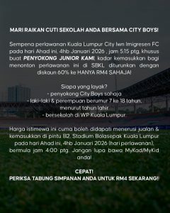 Sempena perlawanan Kuala Lumpur City Iwn Imigresen FC pada hari Ahad ini, 4hb Januari 2026 , jam 5:15 ptg, khusus buat PENYOKONG JUNIOR KAMI, kadar kemasukkan bagi menonton perlawanan ini di SBKL diturunkan dengan diskaun 60% ke HANYA RM4 SAHAJA! Siapa yang layak? – penyokong